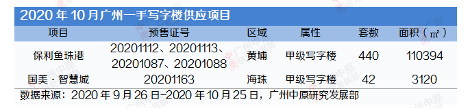 本月写字楼市场仅两个项目获得批售。其中,黄埔区保利鱼珠港新一期产品批量入市,本月收获四张预售证,共计440套11.04万㎡的甲级写字楼。另一项目为国美琶洲的总部项目——国美•智慧城,已于10月18日全新亮相,启动认购招商,本月项目预售的为东塔部分高层单位,共计42套0.31万㎡。