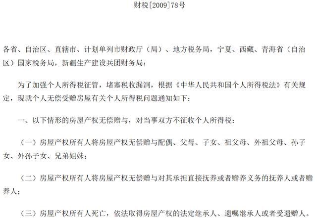 大家仔细看看文件原文按照《财政部 国家税务总局关于个人无偿受赠房屋有关个人所得税问题的通知》(财税〔2009〕78号)排名前列条规定,我们可以发现,其实赠与,继承免个税的政策2009年就已经执行了。事实就是如此,一直以来,广州直系赠与,继承,都是免个税的。请看财税〔2009〕78号内容