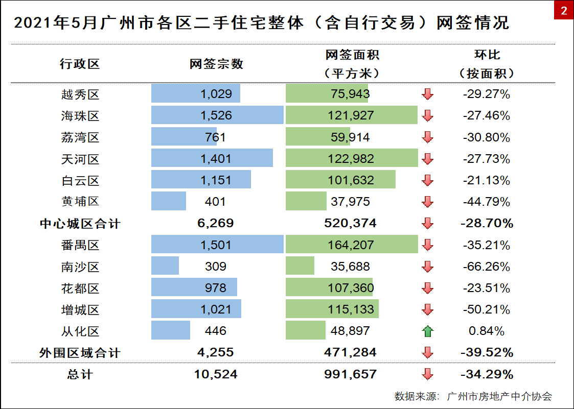 来自广州市房地产中介协会的统计数据显示,5月广州二手住宅整体(中介促成+自行交易)网签10524宗,环比下降34.33%;网签面积99.17万平方米,环比下降34.29%。