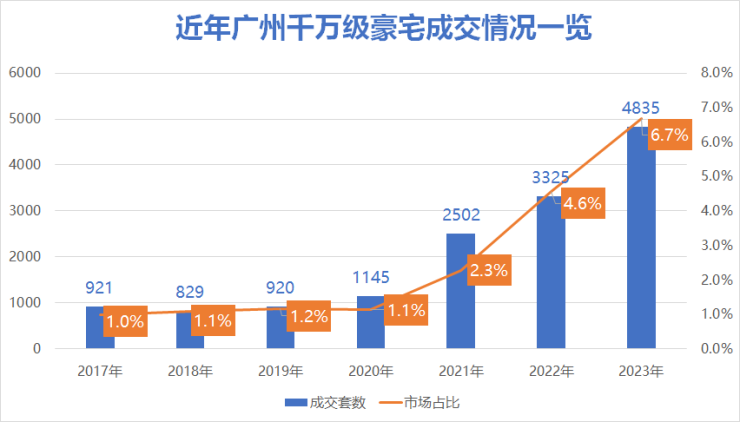 而一手千万级豪宅则走出了独立行情,成交量已逼近5000套大关,创下了新记录。粗略计算,2023年广州日均成交13套千万级豪宅,每天至少贡献1.3个小目标。