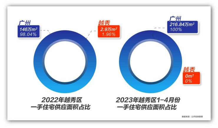 在2022年,越秀区入市一手住宅面积只有2.9万平,只占总量的1.96%,广州倒数第一。踏入2023年,形势更加严峻,1-4月份,新批面积为0,严重供不应求。