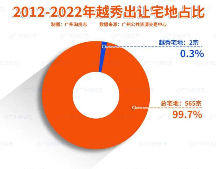 过去10年,广州出让535宗宅地中,越秀区仅占2宗,占比约0.3%,全新住宅项目可谓是可遇不可求。如果换算成建筑面积,在越秀区买到新房的概率,不到全市的0.1%,是真正的“千里挑一”。