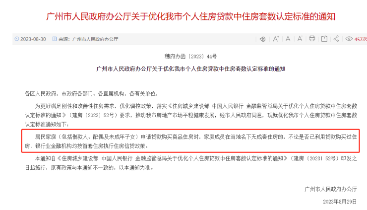 广州:居民家庭购买首套房时,执行“认房不认贷”