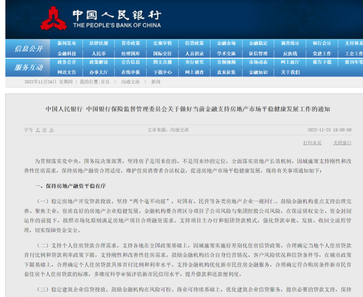 继11月21日中国人民银行、中国银行保险监督管理委员会(以下简称银保监会)召开全国性商业银行信贷工作座谈会后,11月23日晚间,中国人民银行、银保监会发布了《关于做好当前金融支持房地产市场平稳健康发展工作的通知》(以下简称《通知》),提出积极配合做好受困房地产企业风险处置。