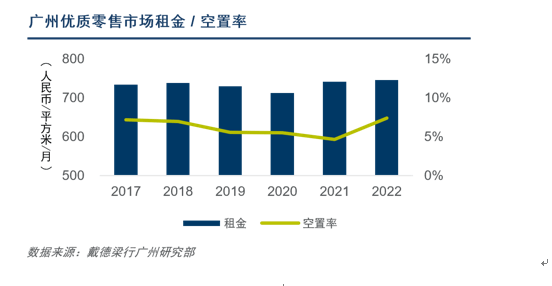 第一太平戴维斯也指出,去年第四季度,广州新开商业项目以较高入驻率开业,支撑全市季度净吸纳量转负为正,且较过去五年均值高37.1%。不过,全年而言,受疫情扰动及个别项目业态及品牌升级调整的影响,全市年度净吸纳量仍远低于过去十年均值,空置率亦随之走高,年末环比上升0.2个百分点、同比上升1.7个百分点,至14.6%。