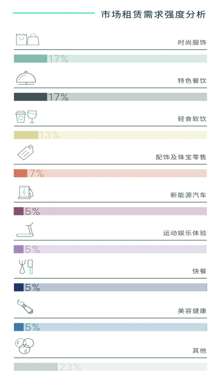 据世邦魏理仕介绍,租户成交方面,时尚服饰、特色餐饮、轻食软饮、配饰及珠宝、新能源汽车和运动娱乐体验业态表现突出,全年录得的新开店铺数量分别位列前六位,占全部成交的67%。