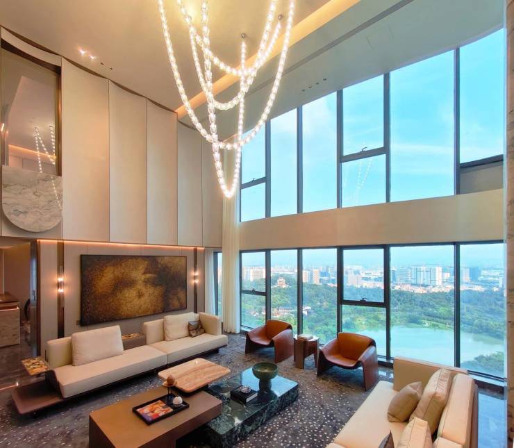果不其然,当我们踏入2栋御湖峯顶复样板间时,气派的阔绰空间感、震撼的观景视野,便是整体格局带给我们的第一印象。