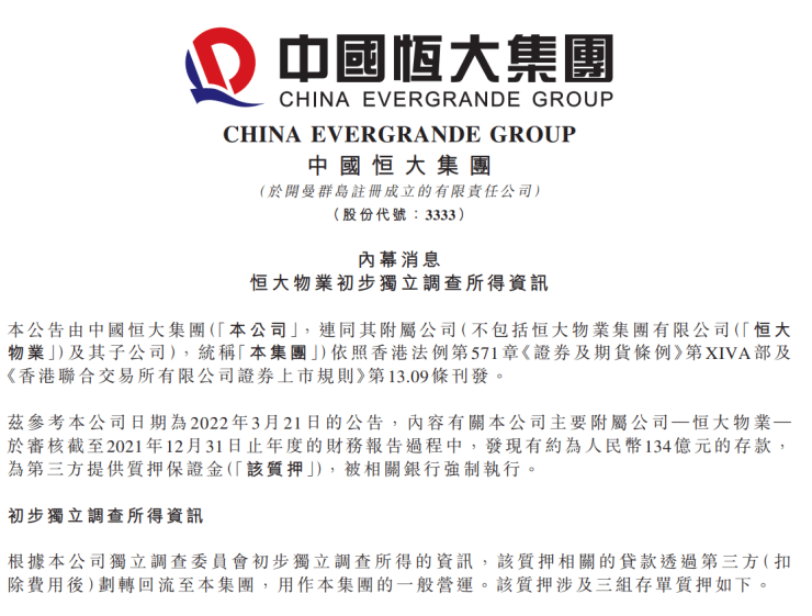 关于对此前恒大物业134亿元存款质押被相关银行强制执行事项的初步调查结果,中国恒大在公告中称,根据独立调查委员会初步调查结果,恒大物业质押相关的贷款通过第三方(扣除费用后)回流至中国恒大,用作其一般营运。同时,中国恒大还在公告中披露了质押所涉三组存单的基本情况。