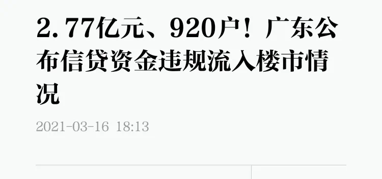 日前,广东有关部门发布数据,广东辖内(不含深圳)银行机构排查发现涉嫌违规流入房地产市场的问题贷款金额2.77亿元、920户,其中广州地区自查发现问题贷款金额1.47亿元、305户。