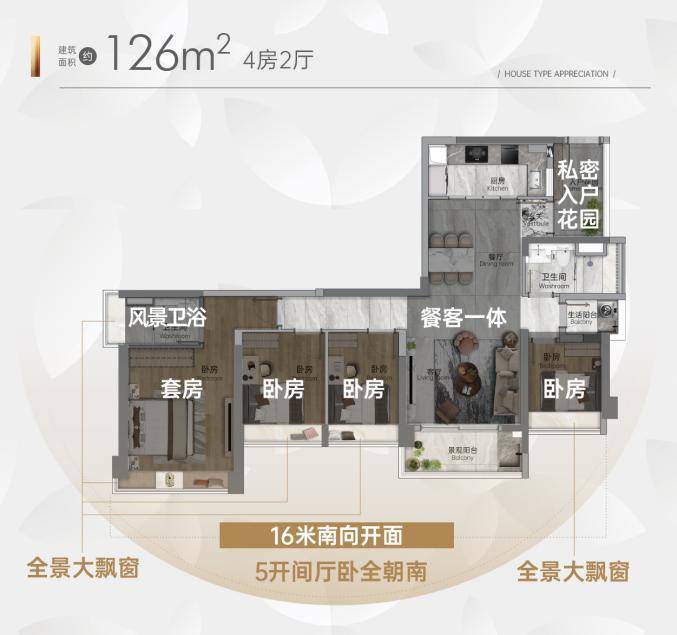 均衡空间的设计理念,做到了每个房间的空间尺度合理,家庭里的每个成员都可以舒适地享受;而全南向的设计,则让家庭里的每位成员都可享受到阳光的沐浴,身心更健康。就如建面约126方四房,16米长的南向开间,客厅与每个卧室皆朝南,每个次卧开间均超过2.2米,家中的每个人都能享有同样充足的舒适,且能满足家庭不同成长阶段的居住需求。