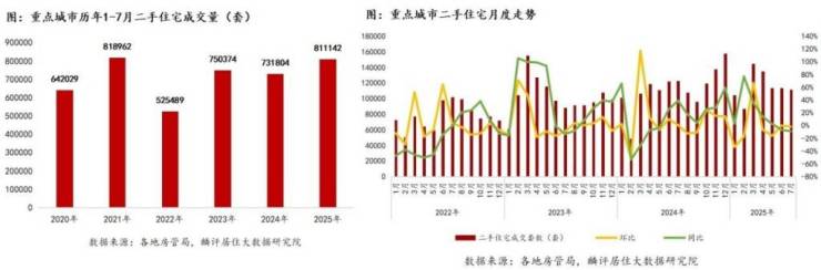 8月6日,麟评居住大数据研究院发布的监测数据显示,2025年7月,监测的重点14城二手住宅成交量为111773套,环比下降1.83%,同比下降9.05%;从累计数据上看,截至7月底,重点14城成交量为811142套,较去年同期上升10.8%。