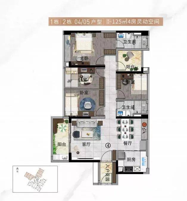 而建面约125㎡“4+1”房,自带入户花园,客厅与餐厅做到了对流设计,客厅连着阳台,餐厅连带大飘窗,通风、采光都非常不错。