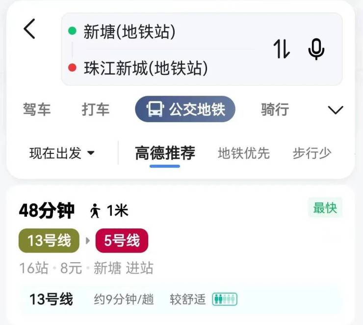 在地理位置上,新塘更近天河及黄埔开发区,比较适合在天河5号线及13号线来往通勤的上班族。从新塘地铁站到珠江新城为例,单程地铁时间约48分钟。(高德地图显示)