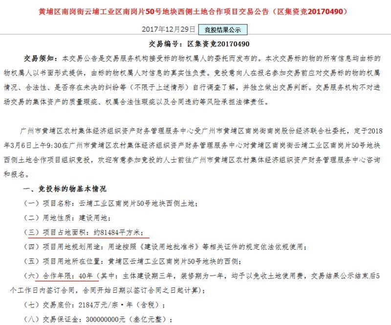 据公告显示,项目占地面积约81484平方米。位于黄埔区云埔工业区南岗片50号地块的西侧。租赁年限为40年。