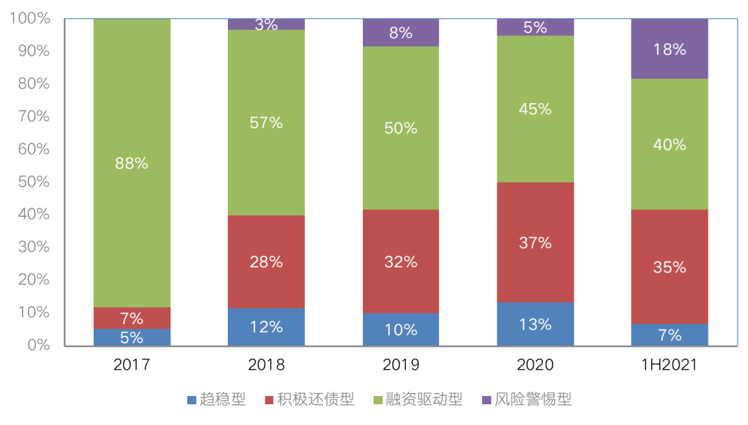 第二类房企经营+投资性现金流净额大于0,但融资性现金流净额小于0,这类房企为积极还债型。2021上半年有35%的房企为积极还债型,预计在三条红线等新规下,积极还债型房企的数量占比在未来仍有望继续扩容。