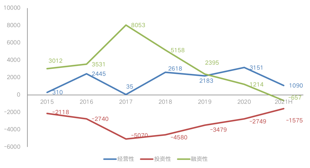 截止至2021年上半年,经营性现金流净额为净流入1090亿元,上年同期为净流出503亿元,预计全年经营性现金流或将进一步增加。