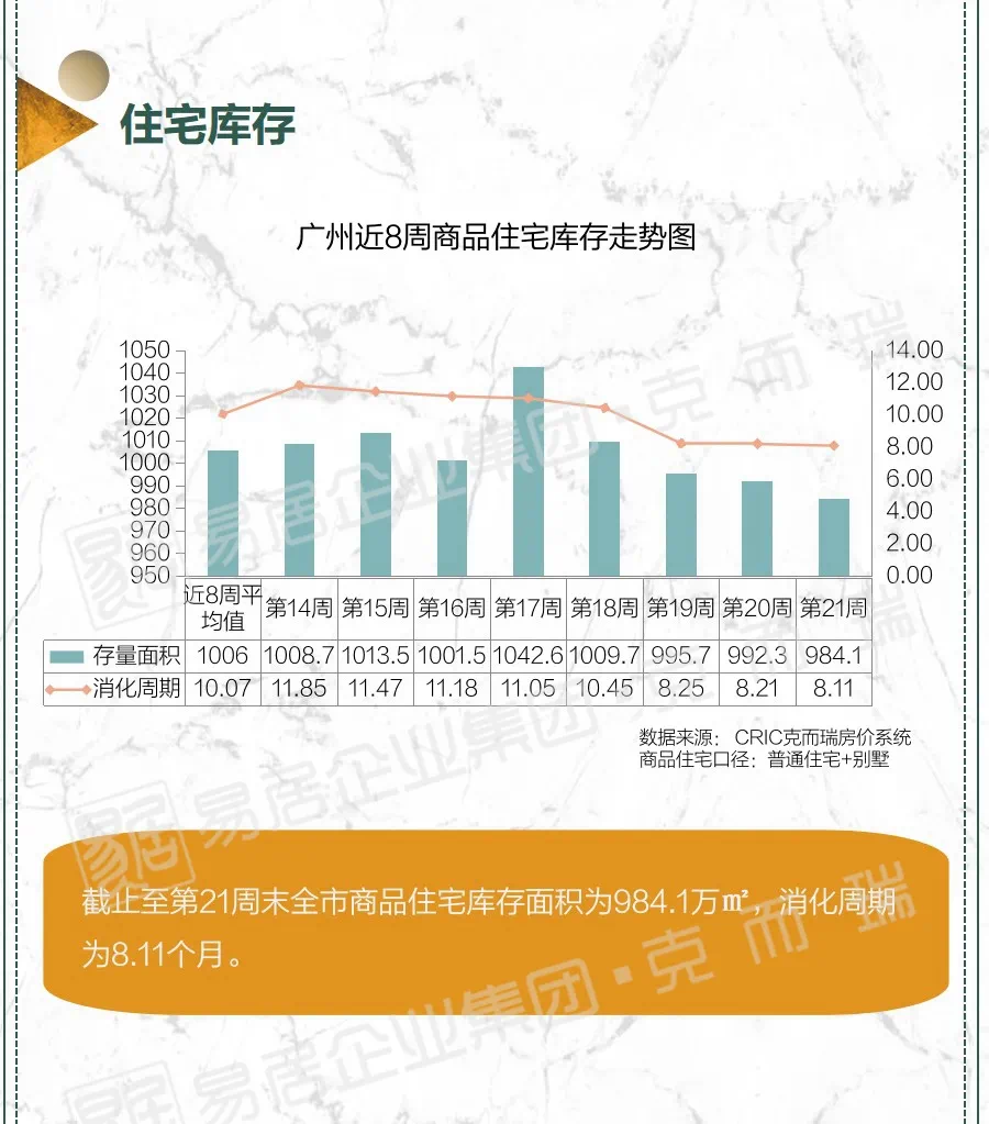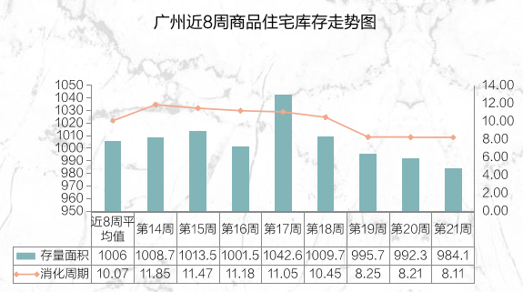 从克而瑞周报获知,截止至第21周末全市新房库存面积为984.1万㎡,消化周期为8.11个月,刷近两月新低。