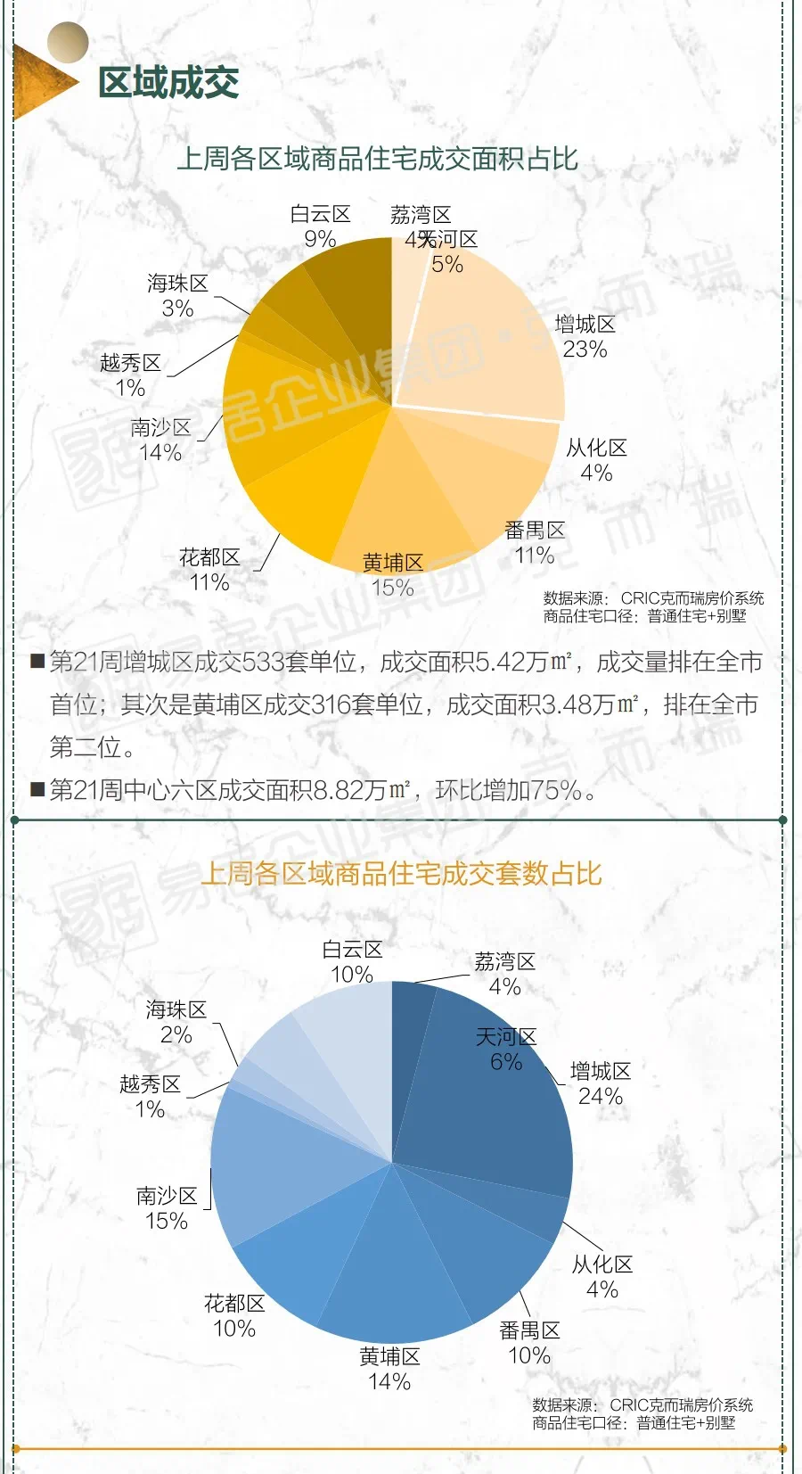其中,增城区成交533套单位,成交面积5.42万㎡,成交量排在全市首位;其次是黄埔区成交316套单位,成交面积3.48万㎡,排在全市第二位。