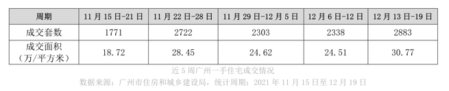 成交方面,当周广州一手住宅成交2883套,环比上升23.31%;面积30.77万平方米,环比上升25.54%。其中,增城、黄埔、番禺分别以624套、623套和394套的成交规模位居前三位。