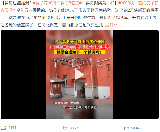 据《凤凰周刊》消息,开网店做生意的丁乐原最初为了找仓库存货,在全国各地找便宜房子。2020年10月,丁乐一口气在河南鹤壁买了8套房子,一共花了10万元。