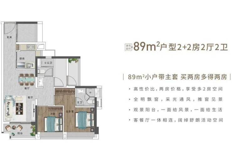 而89㎡户型则为2+2房,在市场上同等面积只能做3房的情况下,多享一重的空间体验,在带主套的同时,打造出4个居住空间,相当于买3房住4房。这无疑是整个南沙市场住宅格局的突破。