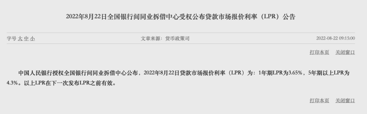 中国人民银行授权全国银行间同业拆借中心公布8月贷款市场报价利率(LPR)为:1年期LPR为3.65%(上月为3.7%),5年期以上LPR为4.3%(上月为4.45%)。相较上月,1年期、5年期LPR分别下降5BP和15BP。