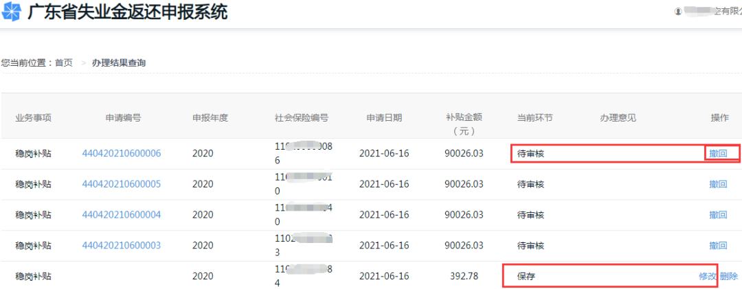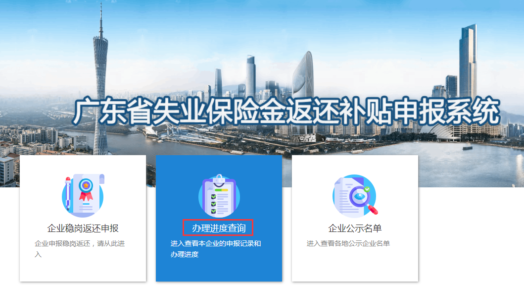 1、登录后,查询路径:广东省失业保险金返还补贴申报系统→办理进度查询。