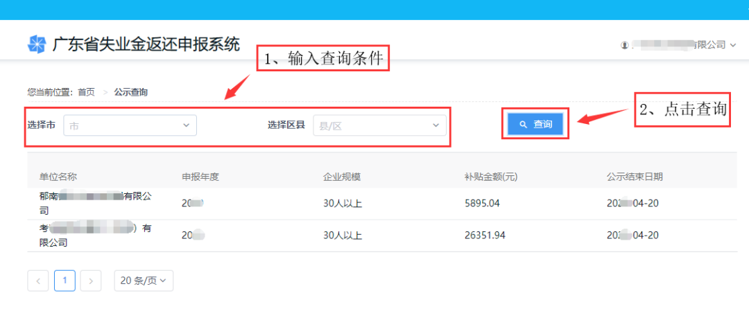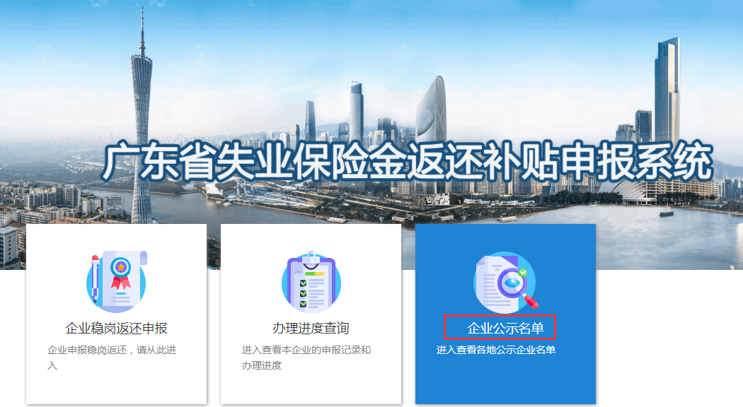 1、登陆后,查询路径:广东省失业保险金返还补贴申报系统→企业公示名单;