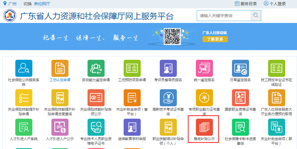 2、直接进入广东省人力资源和社会保障厅网上服务平台,点击稳岗补贴公示。