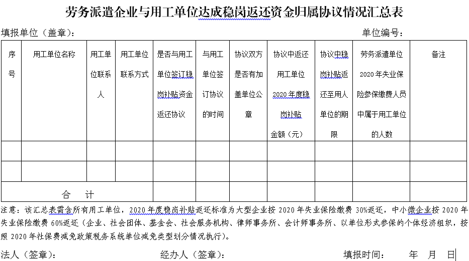 4.劳务派遣企业需填写是否与用工企业签订稳岗返还协议(非劳务派遣企业的不用填写);若选择是,则需按要求将与用工单位达成稳岗返还资金归属协议及《与用工单位达成稳岗返还资金归属协议汇总表》(汇总表见下图)上传附件后,再提交审核。