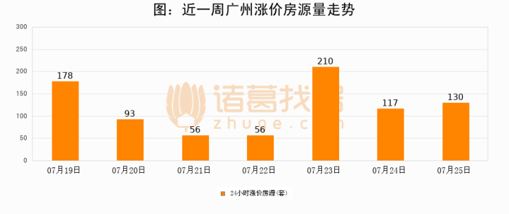 根据诸葛找房数据显示,广州24小时涨价房源量为130套,较07月24日增加13套,环比上涨11.1%。与此同时,涨价房源占比小幅扩大,业主信心有所提升。