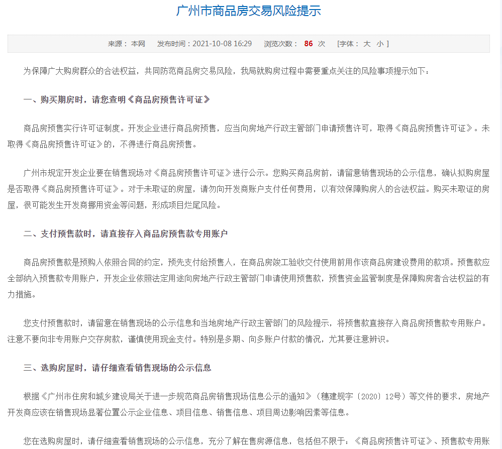 10月8日,广州住房和城乡建设局发文《广州市商品房交易风险提示》(下简称《交易提示》),提醒购房者在支付预售款时,要直接存入商品房预售款专用账户,以免开发商挪用资金;同时,关注房屋抵押状态;预防警惕“代办资格”“伪造流水”“首付贷”等违规违法行为。
