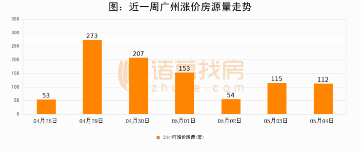 根据诸葛找房数据显示,广州24小时涨价房源量为112套,较05月03日减少3套,环比下降2.6%。与此同时,涨价房源占比小幅回落,对于购房者来说是一个入市窗口期,购房者可抓住时机入市。