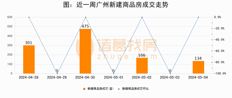 根据广州市住房和城乡建设局数据显示,2024年05月04日广州新建商品房成交134套,较昨日增加134套,环比上涨0%