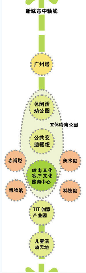 当年规划中轴线南段将是一个倒“T”字形绿轴,核心区的中央绿轴东西宽180米,南北长约2.6公里,中央绿轴南段预留景观视线和开敞绿化廊道,突出标志性景观和滨水景观。中轴线南段地区从北往南分布有中轴绿地公园、海珠湖公园、万亩果园、体育公园和滨江公园,形成完整的生态绿地公园系统。