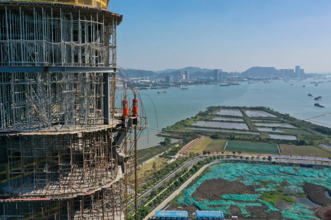 空中连廊位于100米以上高空,连通两栋超高层写字楼,跨度超过60米,钢结构重达1000吨。空中连廊建成后,将成为该项目地标性符号,在这里可以看到美不胜收的海景。