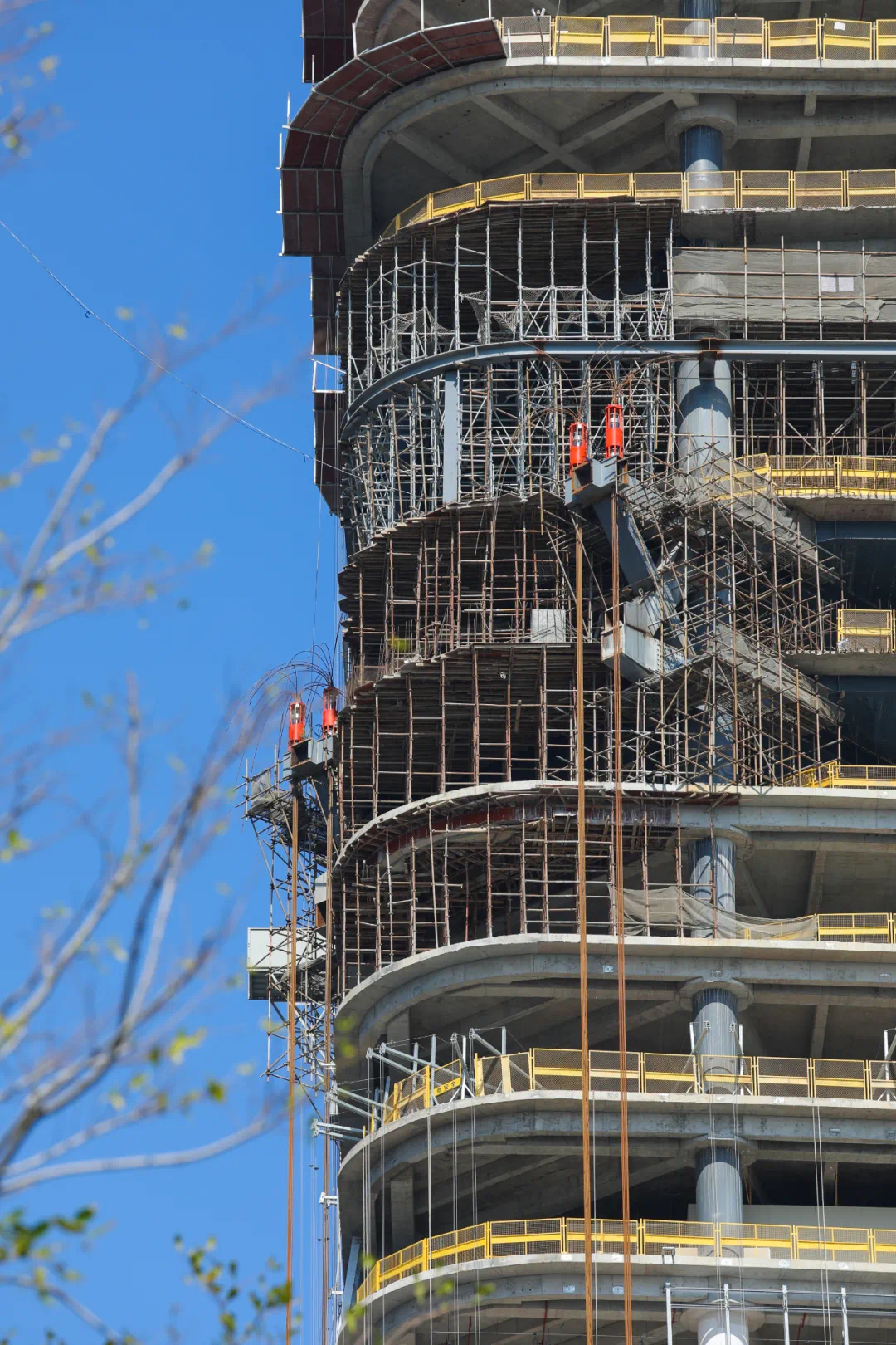 A栋塔楼主体结构施工至40层(共43层),二次结构砌筑已完成至26层,抹灰已完成至20层,22层以下幕墙龙骨安装完成80%,22层以下幕墙玻璃安装完成5%。