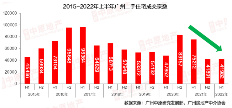 广州中原研究发展部统计显示,上半年广州累计成交新房39618宗,同比下跌35%;二手共成交42002宗(中介网签+自助网签),同比下降44.2%。“目前楼市表现为刚需无力,首改观望,豪宅成交未能支撑楼市,导致上半年广州二手房成交创历史第二低位。”