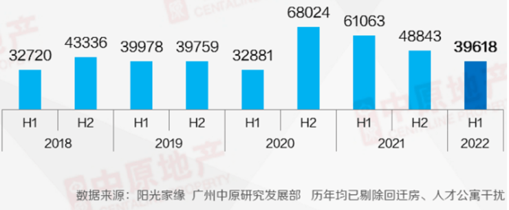 据合富研究院数据,广州上半年全市可售库存走高,6月初库存量1558万平方米,同比上升17%;同时,楼盘获证减少,市场消化余货为主。上半年全市新增供应407万平方米,环比下降51%,同比下降10%;网签成交439万平方米,环比下降24%,同比下降35%。
