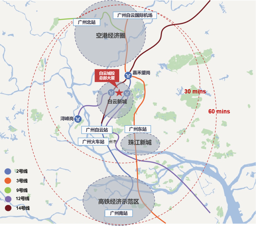 白云城投总部大厦位于白云新城总部经济集聚区核心中轴,距地铁2号线/12号线(规划)交汇站点——白云文化广场站,12号线(规划)、14号线(规划)交汇站点——新市墟站均只有600米,周边连通空港大道、广园快速路等城区主干道,可快速通达白云国际机场、广州白云站、广州南站等大型交通枢纽。
