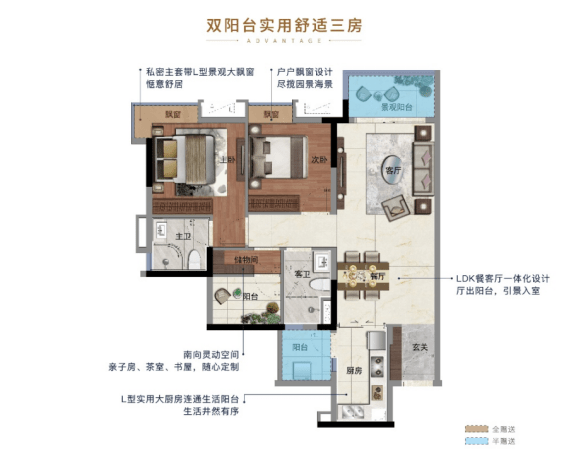 l 约106㎡稀缺东南一线望海三房,拥有三开间朝南,主次卧均配置广角飘窗,保证通风采光度和景观可视度。