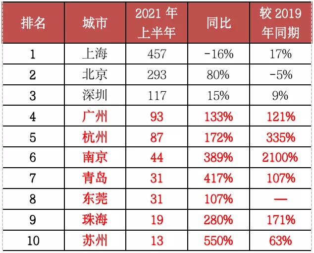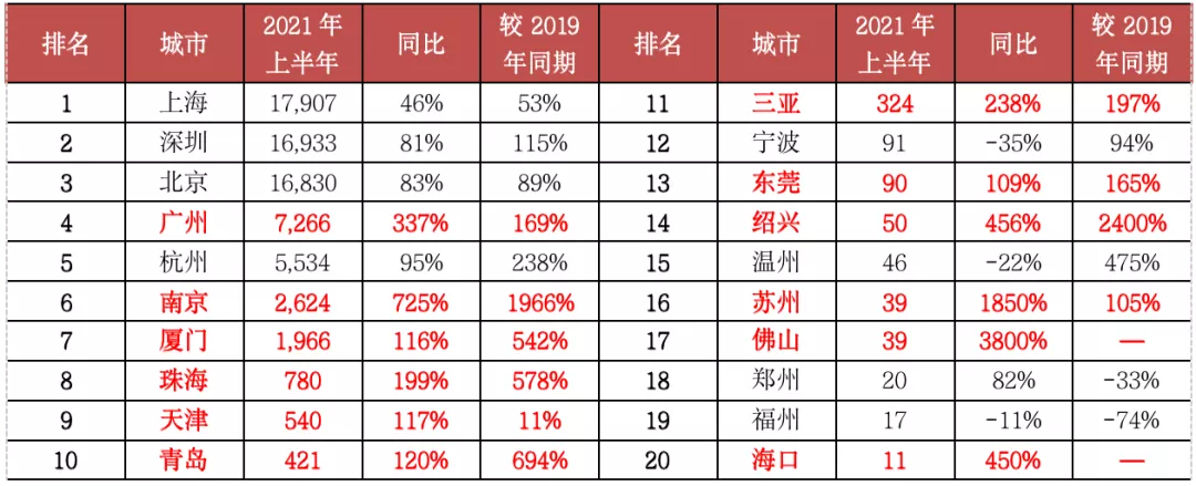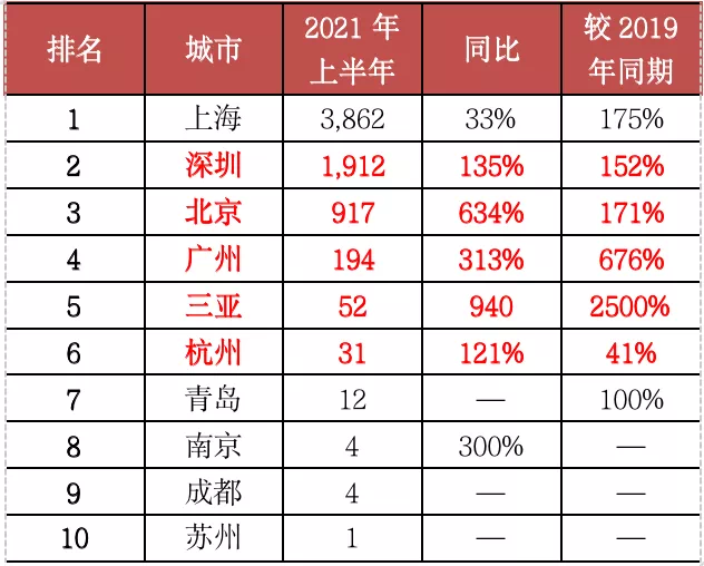 表:2021年上半年单价10万元/平方米以上豪宅成交套数TOP20城市(单位:套)