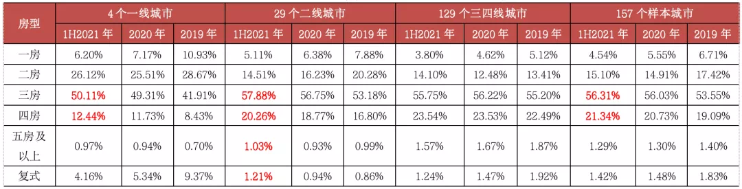 2021年上半年,改善性需求持续释放,三房依然稳居成交主力,157个重点监测城市普通商品住宅成交数据显示,三房户型成交占比达56.31%,较2020年增长0.28个PTS,四房成交比重持续提升,较2020年增长0.61个PTS至21.34%。