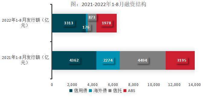 从融资结构来看,8月,信用债规模占比44.5%,海外债占比0%,信托融资占比14.8%,ABS融资占比40.7%。其中,房地产行业信用债融资同比下降43.0%,环比下降45.2%;而其余融资渠道与之前月份相比变动幅度不大。对此,中指研究院分析人士表示,8月信用债融资未能延续之前4个月的相对平稳走势,打破了之前月均发行近500亿元的良好局面。