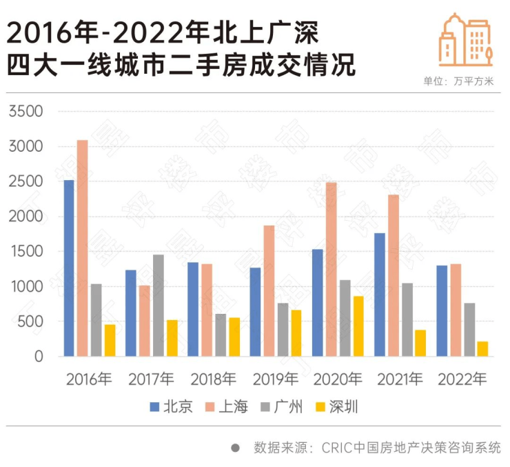 从具体城市来看,四大一线城市累计成交3611万平方米,同比下降34%,其中北上广三城二手房成交规模基本回到了三年前,深圳二手房成交降幅最为明显,全年成交规模仅215万平方米,降幅达到了43%,成交规模创近16年新低。