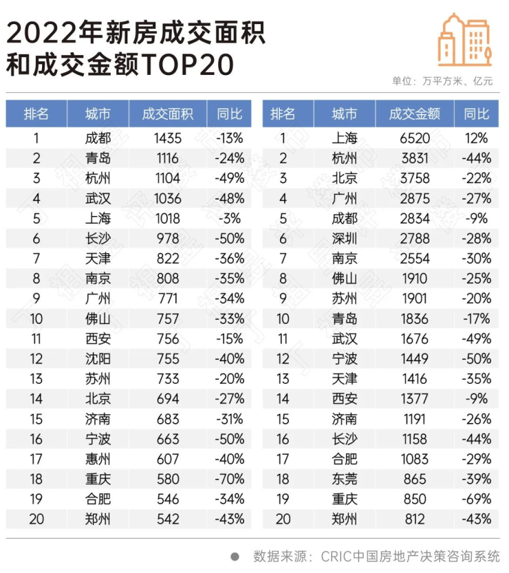 从新房成交面积TOP20城市来看,仅5个城市成交面积破千万,其中成都成交1435万平方米,规模在全国排在首位。从涨跌情况来看,仅上海全年成交面积降幅收窄至-3%,其余城市成交面积均下降10%以上。