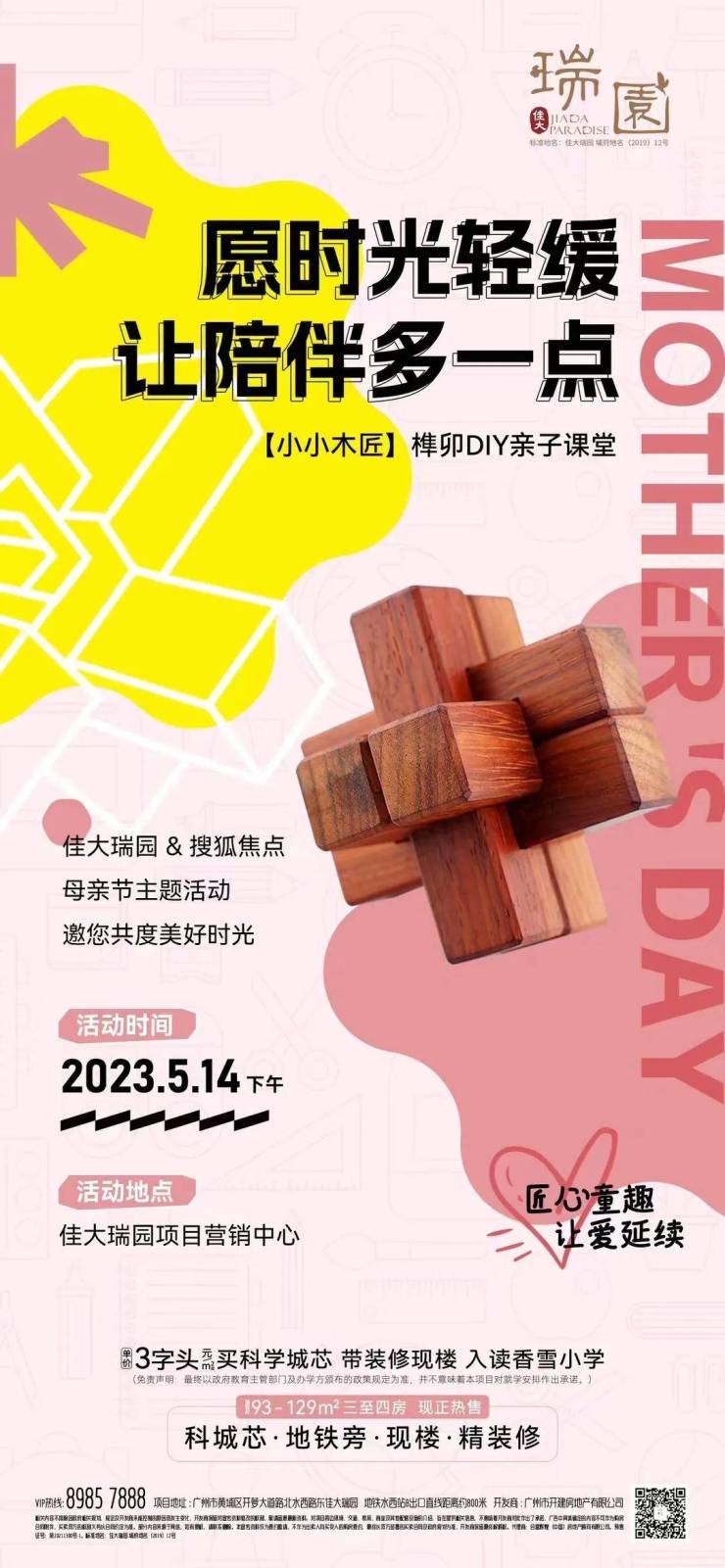 母亲节(5月14日)下午,佳大瑞园&搜狐焦点将联合举办榫卯DIY亲子课堂,诚邀诸位届时前往佳大瑞园营销中心共度亲子时光。