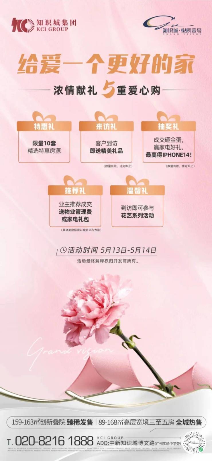 知识城红盘,知识城悦辰壹号周末推出母亲节购房五重礼活动,包含特惠礼(10套特惠房)、来访礼、抽奖礼、推荐礼和温馨礼,活动精彩纷呈。