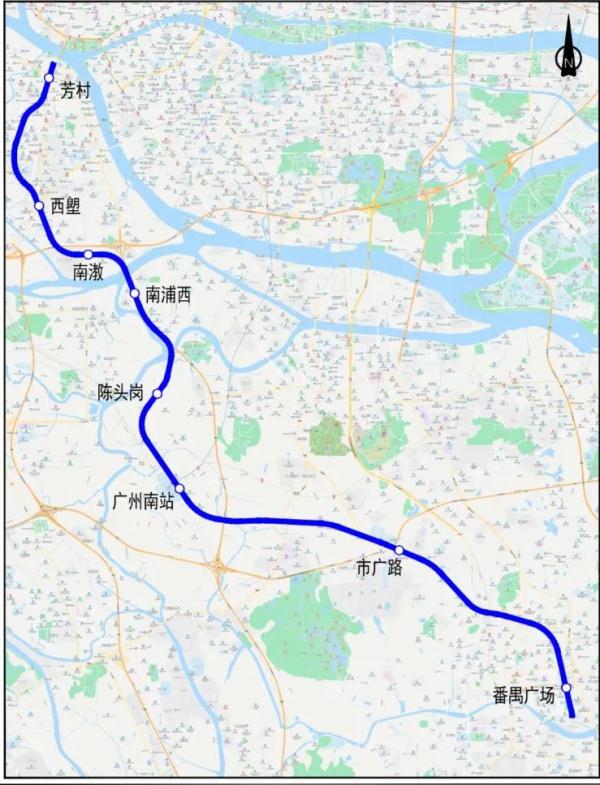 广州地铁22号线是18号线的姊妹线,设计时速同样是160公里。线路首通段全长18.2公里,自北向南设有四座车站:陈头岗、广州南站、市广路、番禺广场。其中,广州南站、番禺广场站与既有线路换乘。