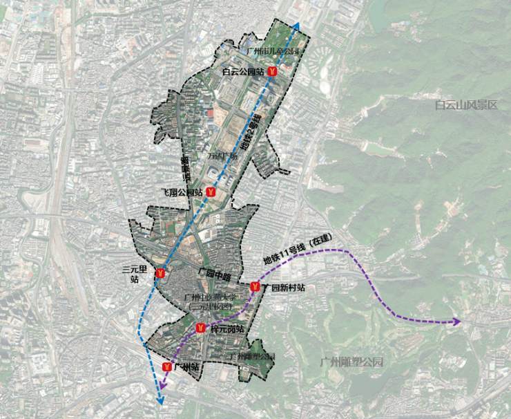 再看其地理位置,位于白云区和越秀区交界,距离广州火车站仅不到1公里,四面被广园路、三元里大道、机场路、环城高速环绕包围。